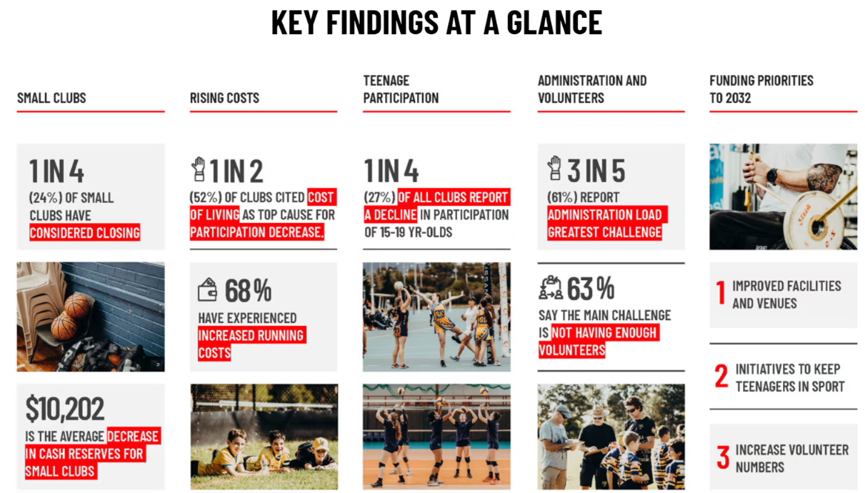 Challenging economic conditions have placed additional strain on community sporting clubs, already struggling with running costs, participation numbers and volunteers after COVID-19 and extreme weather events. (Australian Sports Foundation)