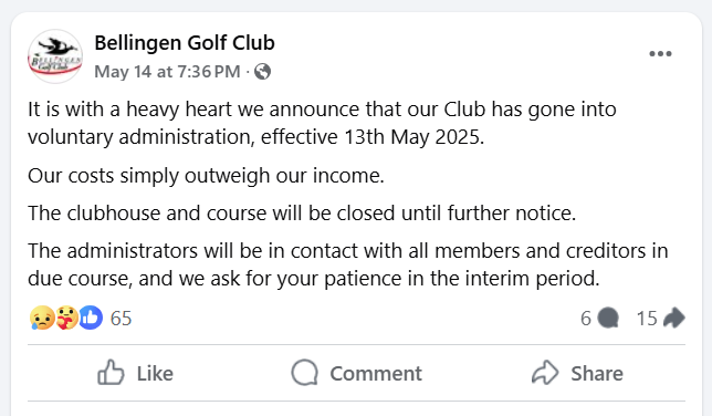 “It is with a heavy heart we announce that our Club has gone into voluntary administration, effective 13th May 2025.