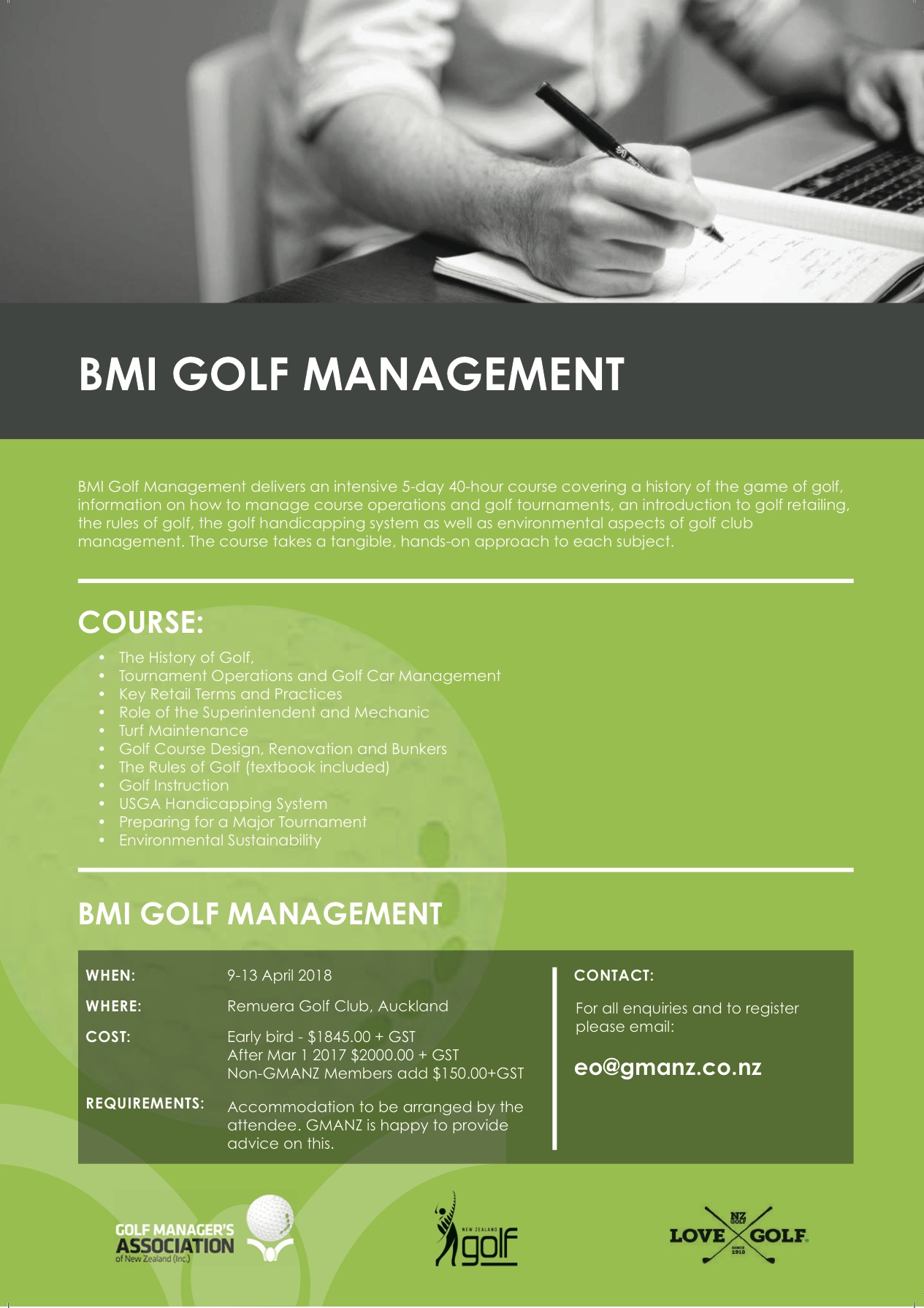 BMI Golf Management delivers an intensive 5-day 40-hour course covering a history of the game of golf, information on how to manage course operations and golf tournaments, an introduction to golf retailing, the rules of golf, the golf handicapping system as well as environmental aspects of golf club management. The course takes a tangible, hands-on approach to each subject.