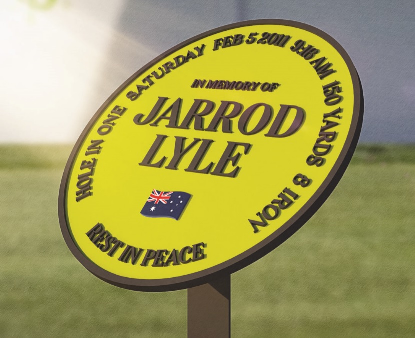 A round plaque, painted yellow and displaying the Australian flag, will be stationed nearby. The middle of the marker reads: “In memory of Jarrod Lyle.” Engraved around the edge are the words: “Hole-in-one, Saturday, Feb. 5, 2011, 9:16 a.m., 150 yards, 8 iron. Rest in Peace.”