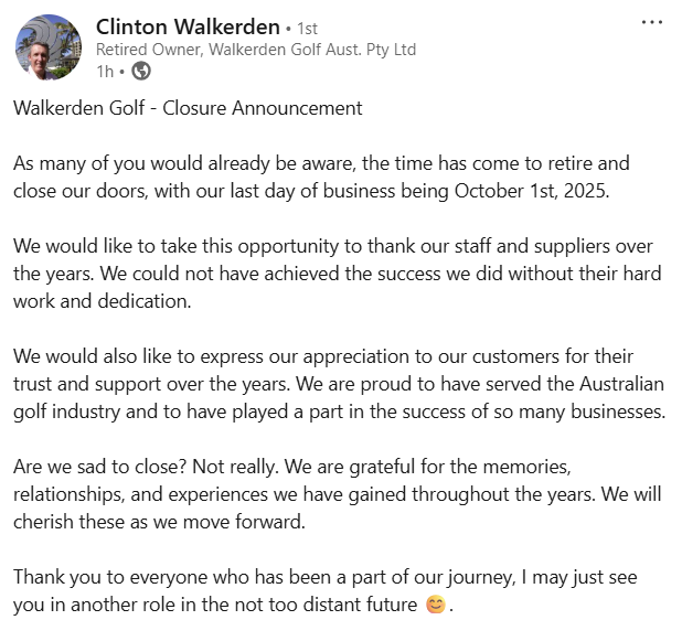 Walkerden Golf, the wholesale distributor of golfing products and accessories that has been a mainstay of the Australian golf industry since 1977, has announced its plan to retire and close its doors. The company’s final day of business was October 1st, 2025.
